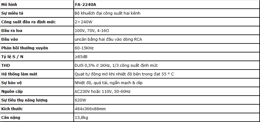 Phạm vi Amplifier công suất hai kênh 2 × 240W FA-2240A hệ thống truyền thanh công cộng được thiết kế cho các ứng dụng truyền thanh công cộng thương mại và công nghiệp. Thiết kế giá đỡ kiểu 2U, công suất định mức là 2 × 240W  bởi hai kênh, cung cấp nhiều lựa chọn để đáp ứng nhu cầu hệ thống âm thanh kích thước khác nhau. Hai đầu vào dòng không cân bằng có thể trực tiếp đầu vào từ các nguồn âm thanh hoặc từ bộ khuếch đại và bộ trộn tiền trước. Loa 70V, 100V và 4-16ohm bởi hai đầu ra riêng biệt kênh thuận tiện cho việc lắp đặt khi lựa chọn kết hợp loa khác nhau, cũng có thể được coi là hai vùng riêng biệt để điều khiển cá nhân. Hai kênh điều khiển âm lượng riêng biệt được bao gồm. Bảo vệ hoàn chỉnh bao gồm clip, ngắn mạch, nhiệt độ cao và quá tải. Các chỉ số về nguồn, tín hiệu, clip, bảo vệ và nhiệt độ.