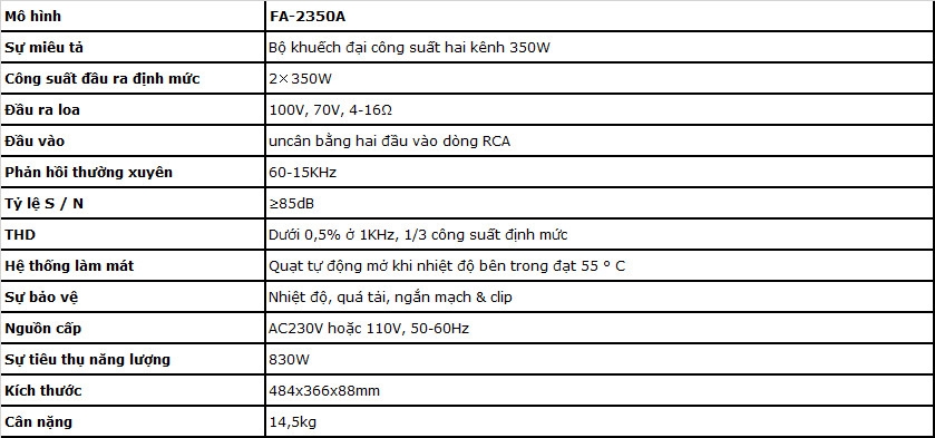 Phạm vi của Amplifier công suất hai kênh 2 × 350W FA-2350A cho hệ thống truyền thanh công cộng hoặc hệ thống PA Bộ khuếch đại công suất hai kênh được thiết kế cho các ứng dụng truyền thanh công cộng thương mại và công nghiệp nói chung. Thiết kế giá đỡ kiểu 2U, công suất định mức là 2 × 350W  bởi hai kênh, cung cấp nhiều lựa chọn để đáp ứng nhu cầu hệ thống âm thanh kích thước khác nhau. Hai đầu vào dòng không cân bằng có thể trực tiếp đầu vào từ các nguồn âm thanh hoặc từ bộ khuếch đại và bộ trộn tiền trước. Loa 70V, 100V và 4-16ohm bởi hai đầu ra riêng biệt kênh thuận tiện cho việc lắp đặt khi lựa chọn kết hợp loa khác nhau, cũng có thể được coi là hai vùng riêng biệt để điều khiển cá nhân. Hai kênh điều khiển âm lượng riêng biệt được bao gồm. Bảo vệ hoàn chỉnh bao gồm clip, ngắn mạch, nhiệt độ cao và quá tải. Các chỉ số về nguồn, tín hiệu, clip, bảo vệ và nhiệt độ.