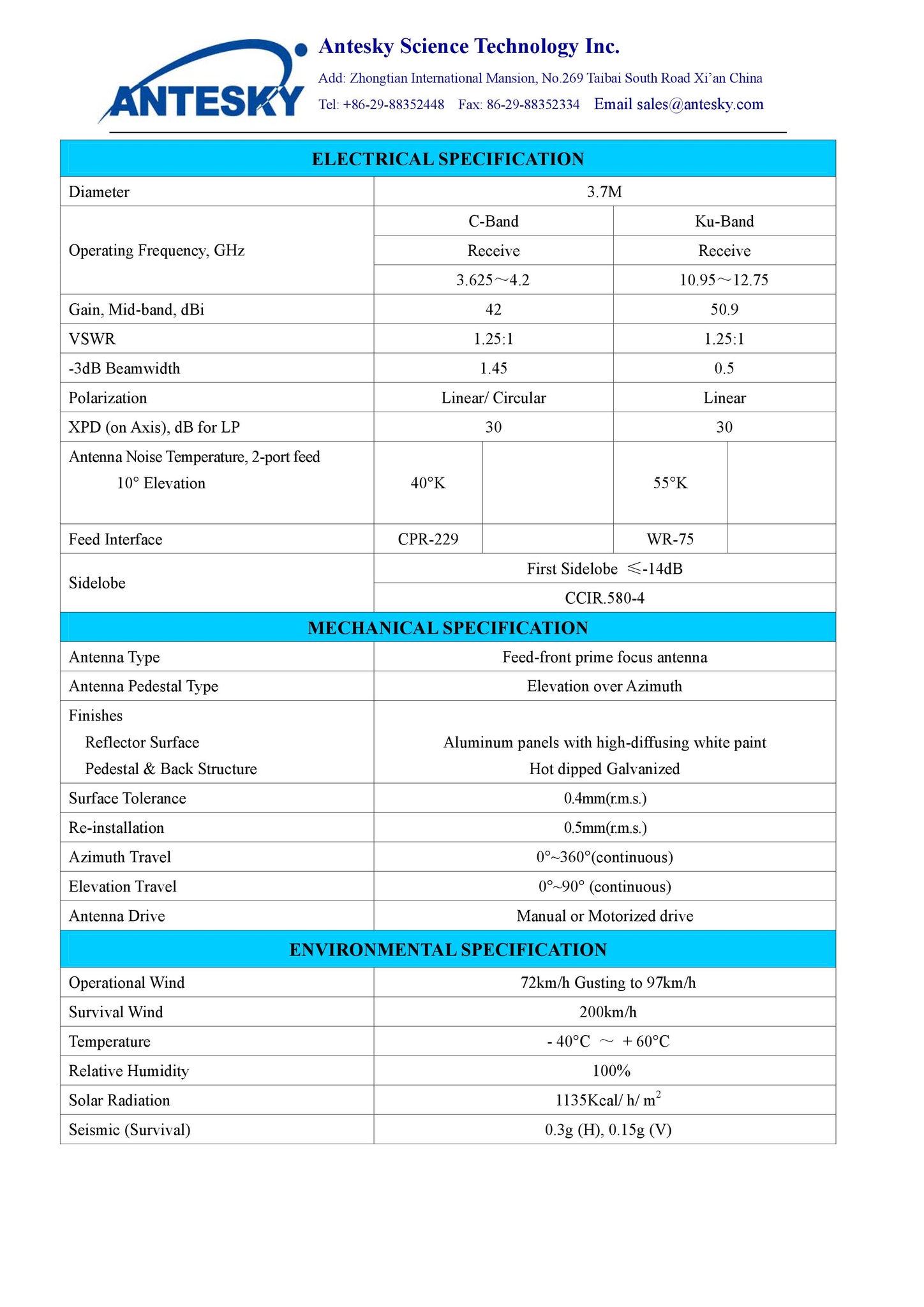Anten Parabol Antesky 3.7m là một Anten chuyên nghiệp cho tất cả các loại trạm đất Tx / Rx và TVRO chỉ nhận được ăng-ten. Những Anten tiêu cự chính có các tính năng của hiệu suất cao với phạm vi đường kính từ 1,2m đến 16m. Bảng phản xạ được làm bằng nhôm với độ chính xác cao. Chúng tôi cũng có thể cung cấp băng tần kép C & Ku TVRO chỉ nhận được Dish. Antesky cũng có thể tùy chỉnh Anten lớn dựa trên yêu cầu cụ thể của khách hàng, Antesky là nhà cung cấp Anten TVRO chuyên nghiệp, Hy vọng sẽ phục vụ cho người dùng trên toàn thế giới.