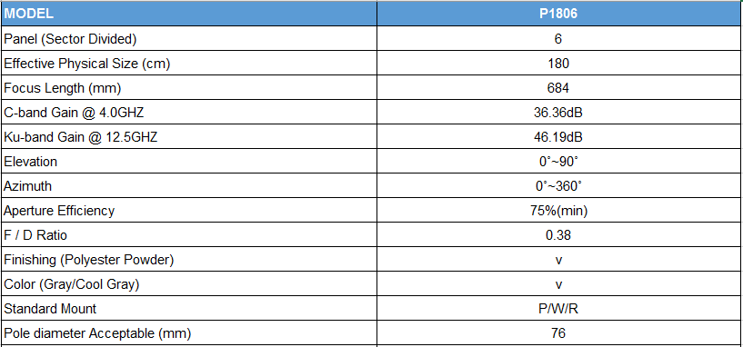 Anten Parabol Jonsa C Band 1.8m P1806  Là anten Band C dân dụng, dùng thu bắt tín hiệu vệ tinh băng tần C ( có thể dùng để thu băng tần Ku ), chất liệu tôn, 6 tấm ghép lại, Thu được hầu hết các vệ tinh có phủ sóng tại khu vực VN….. Đảm bảo chất lượng tín hiệu ổn định, giá thành hợp lý, lắp ghép nhanh, đơn giản…