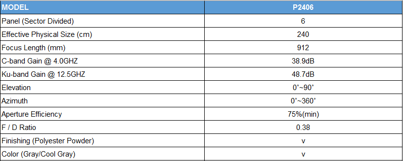 Anten Parabol Jonsa C Band 2.4m P2406  Là anten Band C dân dụng, dùng thu bắt tín hiệu vệ tinh băng tần C ( có thể dùng để thu băng tần Ku ), chất liệu tôn, 6 tấm ghép lại, Thu được hầu hết các vệ tinh có phủ sóng tại khu vực VN….. Đảm bảo chất lượng tín hiệu ổn định, giá thành hợp lý, lắp ghép nhanh, đơn giản…