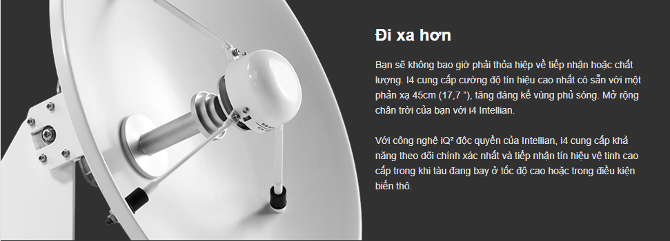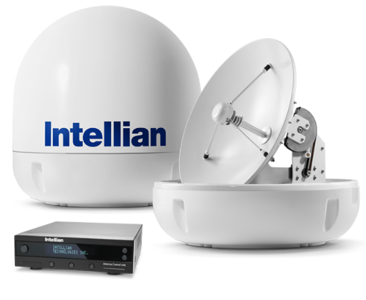 Anten vệ tinh cho tầu biển Intellian i4/i4P (45 cm,18 inch) phổ biến nhất cho các tàu thuyền, thuyền đánh cá, tàu thuyền và tàu thương mại dài khoảng 12m (35ft) đến 20 (60ft).