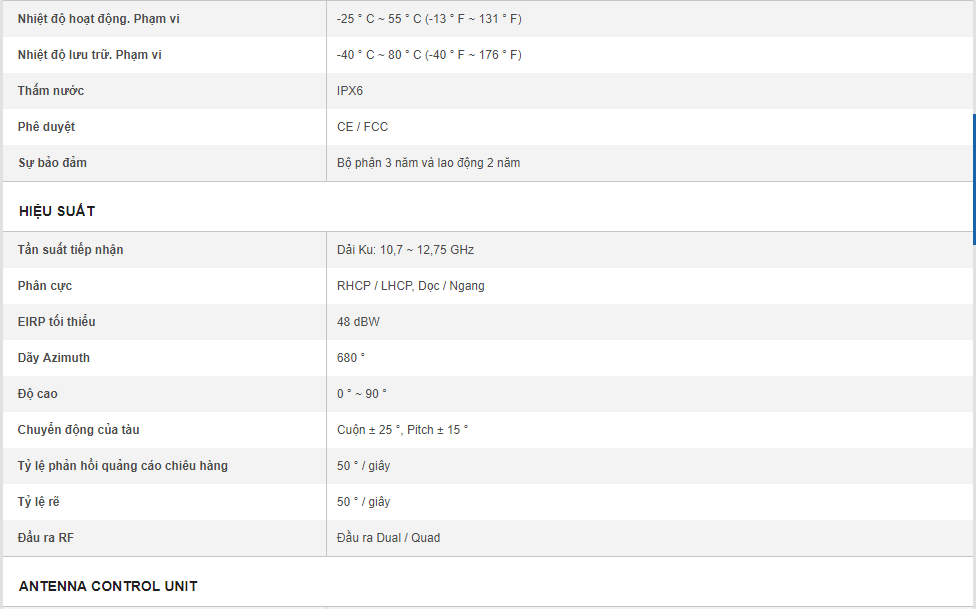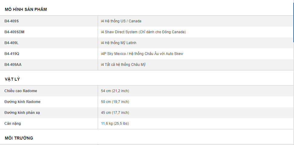 Đường kính radome 50cm (19,7 inch) Ăng-ten nặng dưới 11,6 kg (25,5 pounds) |