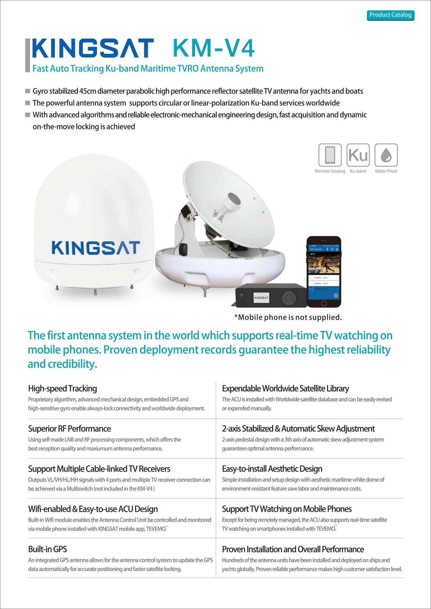 Anten vệ tinh cho tầu biển Kingsat TVRO KM- V4 đầu tiên trên thế giới hỗ trợ xem TV theo thời gian thực trên điện thoại di động. Chứng minh hồ sơ triển khai độ tin cậy cao nhất.