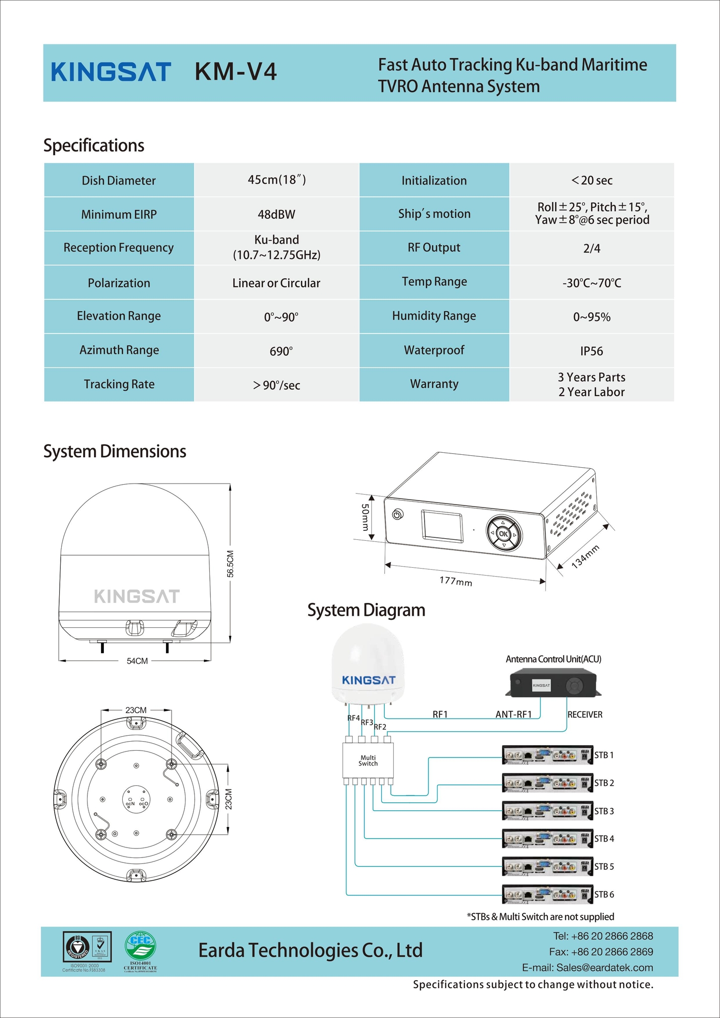 Anten vệ tinh cho tầu biển Kingsat KM-V4 là một Anten Hàng hải. Con quay hồi chuyển ổn định đường kính 45cm parabol hiệu suất cao phản xạ ăng ten truyền hình vệ tinh cho du thuyền và thuyền.
