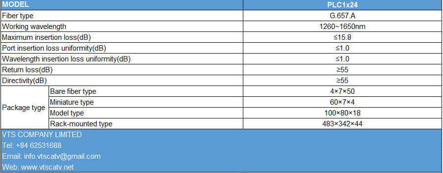 Bộ chia quang 1x24- Optical splitter PLC 1x24 là bộ chia đơn có tỷ lệ chia đều từ một sợi đầu vào thành nhiều sợi đầu ra. Bộ chia quang 1x24- Optical splitter PLC 1x24, với 1 sợi đầu vào và 24 đầu ra với tỷ lệ chia đều trên tất cả các sợi bất kể bước sóng đầu vào. Bộ chia quang 1x24- Optical splitter PLC 1x24 sẵn sàng với sợi đơn sợi đơn lẻ 900µm và bị chấm dứt hoặc không được đáp ứng theo nhu cầu của bạn.
