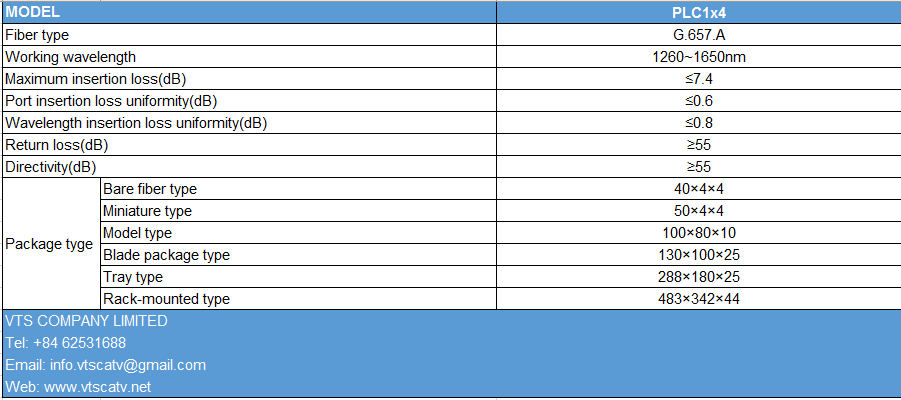 Bộ chia quang 1x4- Optical splitter PLC 1x4 được thiết kế laoij có connector và loại không có connector để khách hàng dễ dàng lựa chọn. Bộ chia quang PLC 1x4 được kết nối có sẵn với sự lựa chọn của bạn của Đầu nối cáp quang: LC / UPC, LC / APC, SC / UPC, SC / APC, FC / UPC, FC / APC và ST / UPC.
