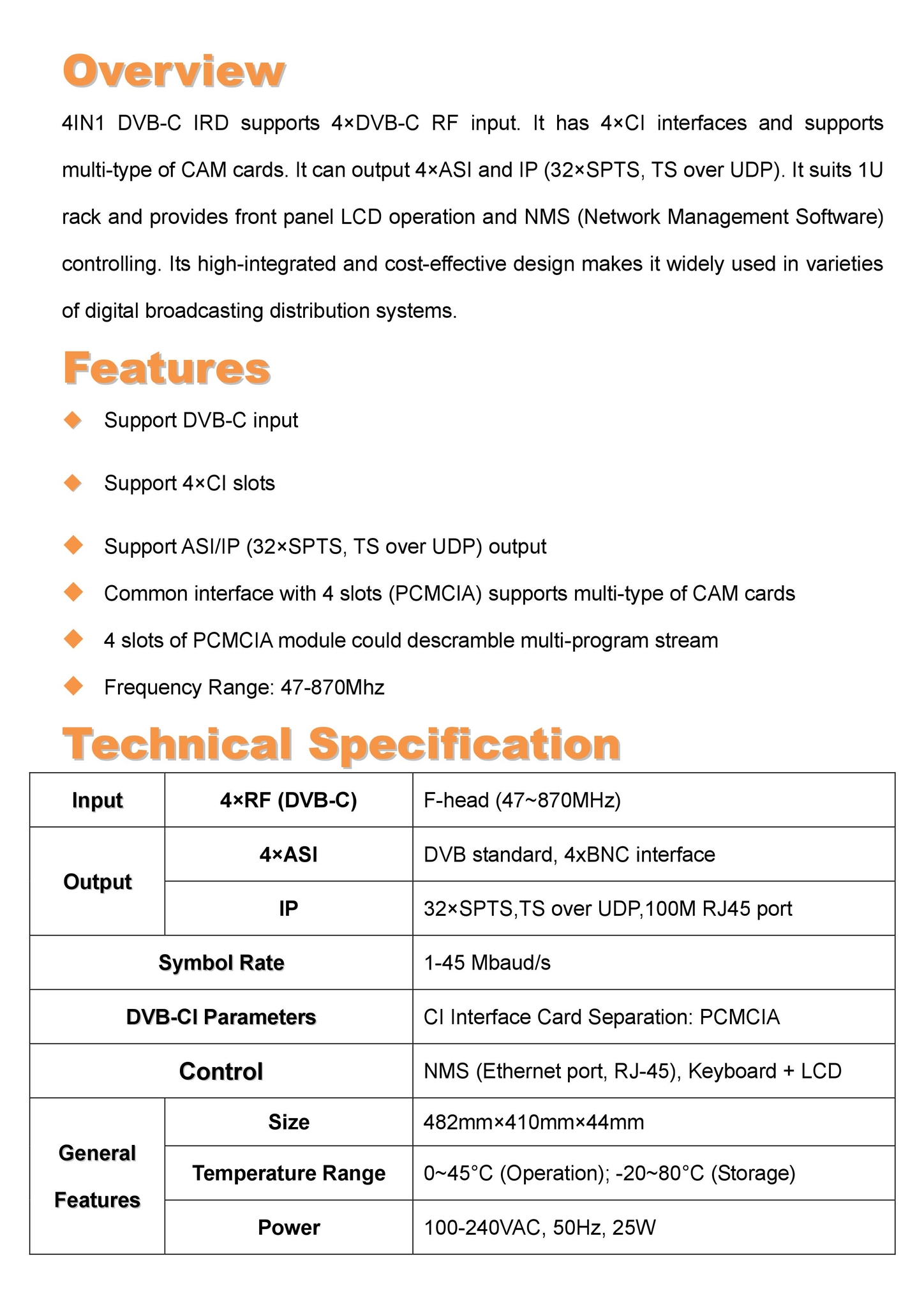 Bộ điều chế 4 in1 DVB-C sang IP VT-5119 hỗ trợ đầu vào RF 4 * DVB-C. Nó có giao diện 4 * CI và hỗ trợ nhiều loại thẻ CAM. Nó có thể xuất 4 * ASI và IP (32 * SPTS, TS qua UDP). Nó phù hợp với giá đỡ 1U và cung cấp hoạt động LCD phía trước và điều khiển NMS (Phần mềm quản lý mạng). Thiết kế tích hợp cao và hiệu quả về chi phí khiến nó được sử dụng rộng rãi trong các hệ thống phân phối phát sóng kỹ thuật số.