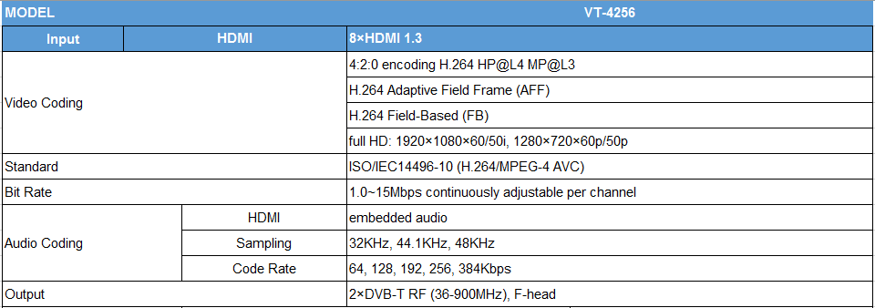 Bộ điều chế 8 in1 HD sang DVB-T VT-4256. Hỗ trợ đầu vào 8 HDMI và đầu ra 2 RF (DVB-T). Sau khi mã hóa và điều chế, tín hiệu đầu vào có thể được trực tiếp đầu ra hoặc hỗn hợp đầu ra với tín hiệu truyền hình ban đầu.