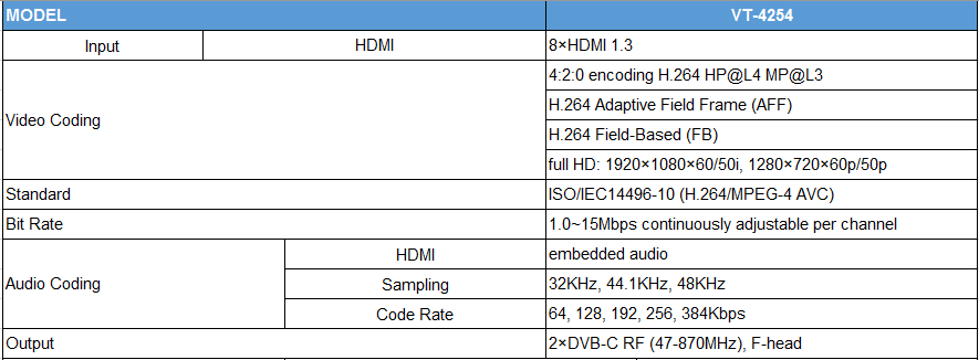 Bộ điều chế 8 IN1 HD sang DVB-C VT-4254. Hỗ trợ đầu vào 8 HDMI và đầu ra 2 RF (DVB-C). Sau khi mã hóa và điều chế, tín hiệu đầu vào có thể được trực tiếp đầu ra hoặc hỗn hợp đầu ra với tín hiệu truyền hình ban đầu.