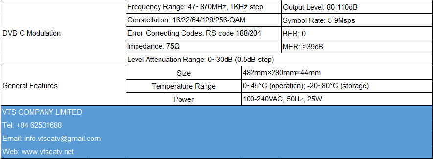 Bộ điều chế VT-4254 thiết kế cao cấp và chi phí hiệu quả của nó làm cho nó được sử dụng rộng rãi trong các hệ thống phân phối kỹ thuật số như đầu cáp kỹ thuật số truyền hình số.