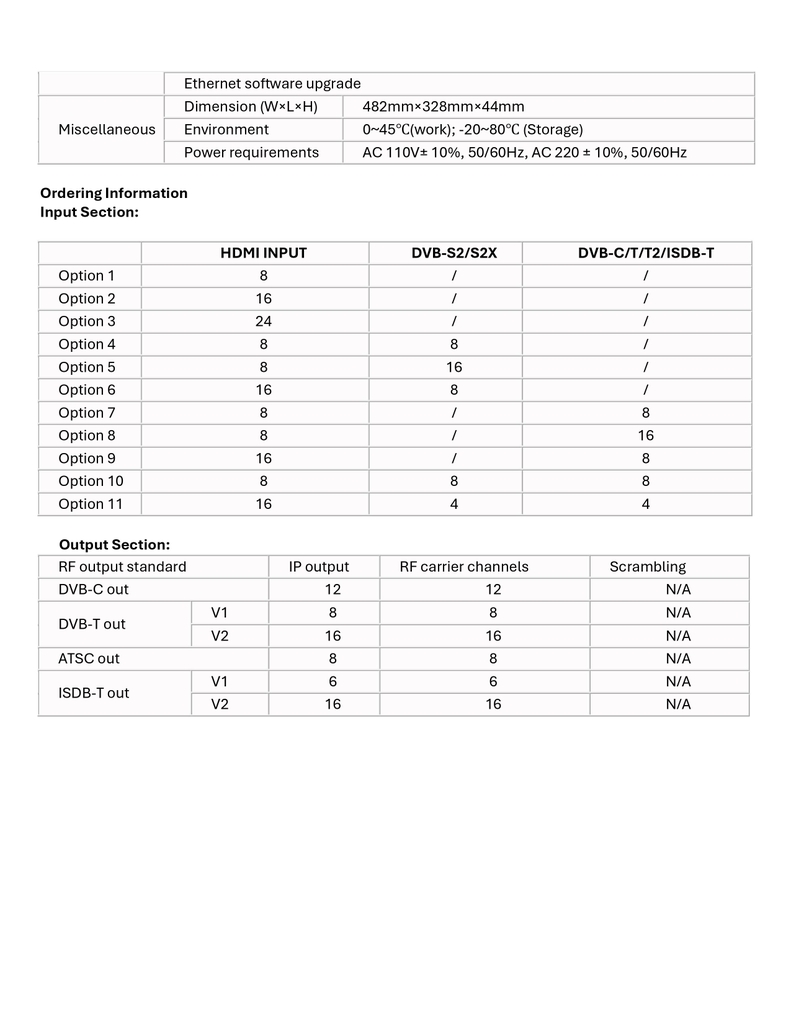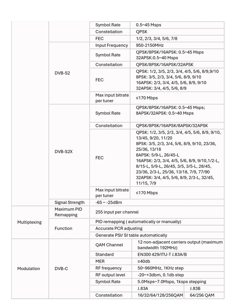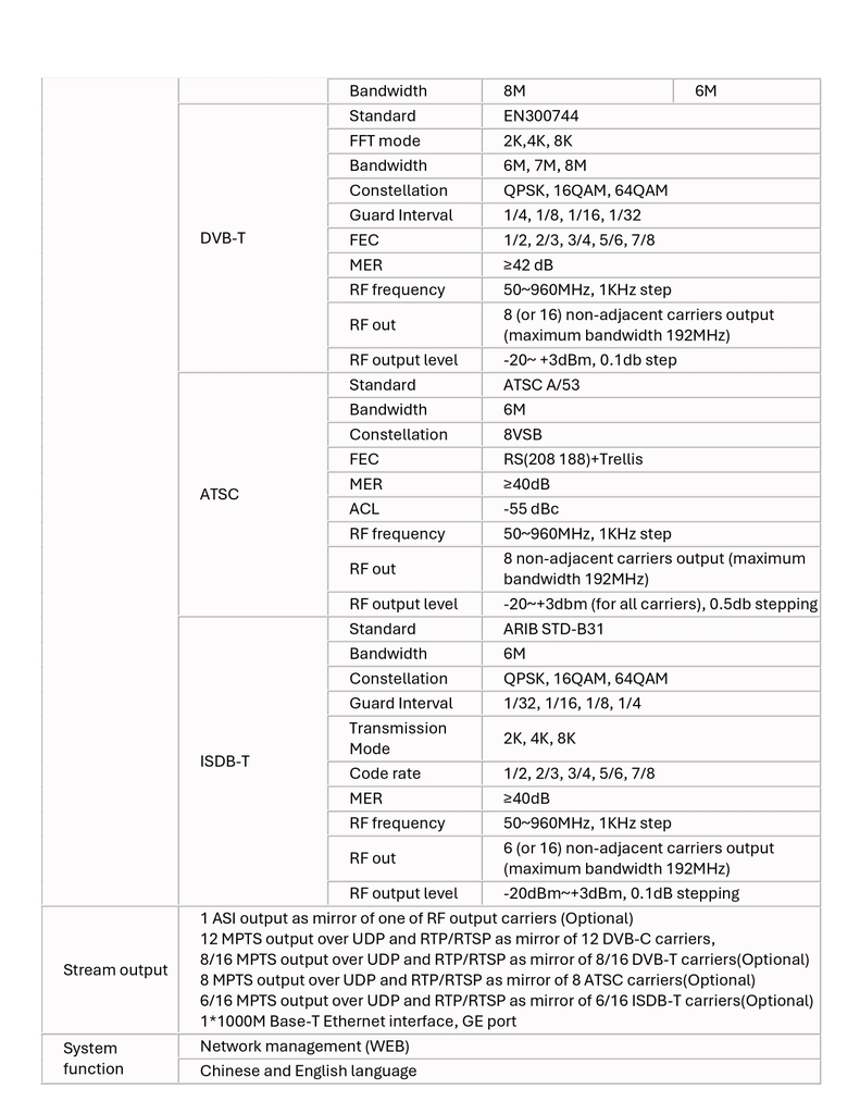 • Hỗ trợ 12 kênh DVB-C Đầu ra RF (đầu ra DVB-T 8 kênh/16 kênh, ATSC 8 kênh hoặc ISDB-T 6 kênh/16 kênh tùy chọn, theo đơn đặt hàng)