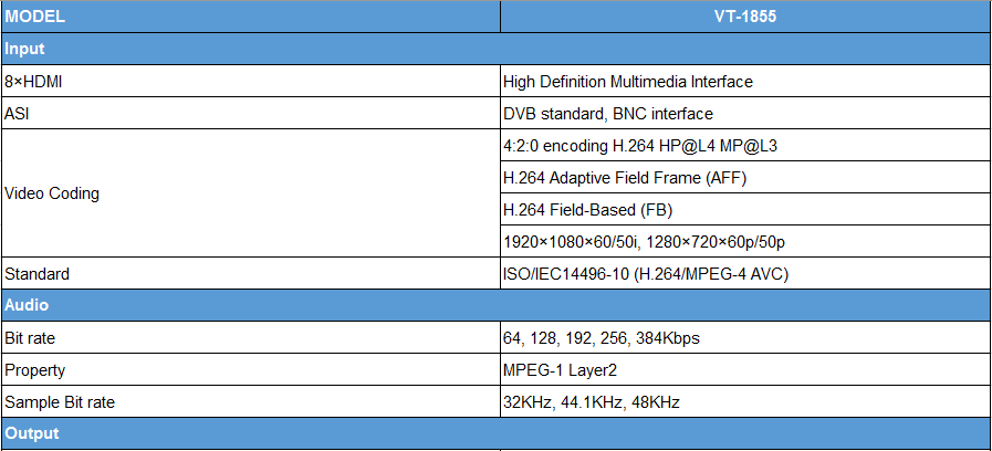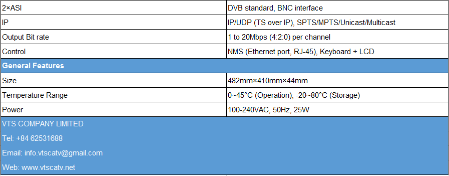 Bộ mã hóa - Encoder 8 in 1 HD sang IP VT-1855. Hỗ trợ 8 cổng HDMI và ASI đầu vào, và tín hiệu ra ASI và IP (TS over IP). Bộ mã hóa - Encoder 8 in1 HD sang IP VT-1855 phù hợp với giá đỡ 1U và hỗ trợ 1080i, 720p và HDCP. Bên cạnh đó, nó có thể được vận hành bởi cả LCD / Bàn phím và NMS (Phần mềm quản lý mạng).