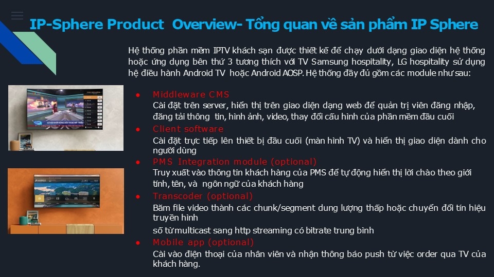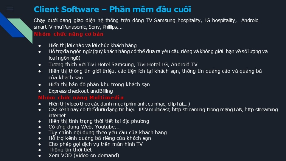 Giải pháp truyền hình IPTV cho Khách sạn - vHotel là giải pháp mở, tương thích và dễ dàng cập với hệ thống khách sạn ban đầu. Nó cung cấp Live TV, VOD, Dịch vụ phòng, Dịch vụ Thực phẩm và Đồ uống và các dịch vụ giá trị gia tăng khác. vHotel cũng có thể thiết kế giải pháp theo yêu cầu đặc biệt của khách hàng.