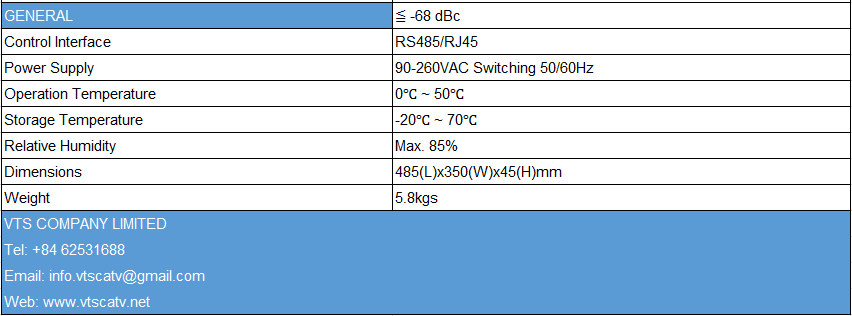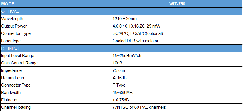 Máy phát quang 1310nm WINERSAT WIT-750 sử dụng diode laser DFB làm nguồn sáng, chuyển đổi điều chế RF CATV (AM-VSB) thành tín hiệu quang được truyền qua sợi quang, sau đó chuyển trở lại tín hiệu RF thông qua bộ thu. Các tín hiệu RF sau đó được phân phối cho người dùng cuối.