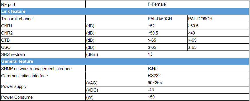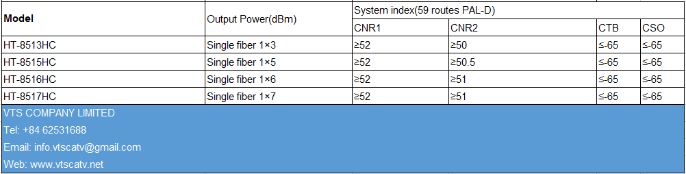 VTS là nhà phân phối nổi tiếng trong máy phát quang được điều chế bên ngoài tương tự trên thế giới. Máy phát quang 1550nm HT-8510HC phù hợp với tiêu chuẩn kỹ thuật công nghiệp quốc tế hiện tại là Máy phát quang điều chế bên ngoài 1550nm. Toàn bộ nguồn ánh sáng đơn vị sử dụng băng thông hẹp (0.65MHz), tiếng ồn thấp, laser DFB sóng liên tục, rất thuận lợi để giảm ảnh hưởng của sự phân tán. Điều chế tín hiệu toàn bộ đơn vị thông qua bộ điều biến bên ngoài CATV đặc biệt LiNbO3 của công ty Mỹ và công nghệ điều khiển tối ưu VTS với sở hữu trí tuệ độc lập, vì vậy nó có thể đạt chỉ số cao trở lại CNR ≥ 54dB, CTB ≤ -65dB, CSO ≤ -65dB, SBS: 13, 16, 18dBm có thể điều chỉnh. Toàn bộ thiết bị được trang bị giao diện truyền thông RS232 hoàn hảo, quản lý mạng SNMP, cung cấp điện dự phòng 1 + 1, chức năng cắm nóng,