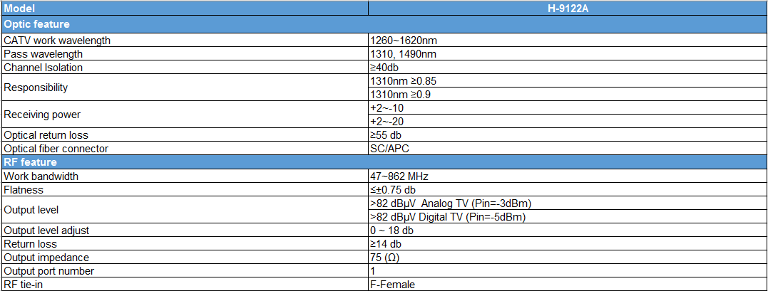 Máy thu quang FTTH - Node quang H-9122A : Bước sóng hoặt động 1260 ~ 1620nm. Băng thông hoặt động 47-862MHz, tín hiệu RF ra: 82db