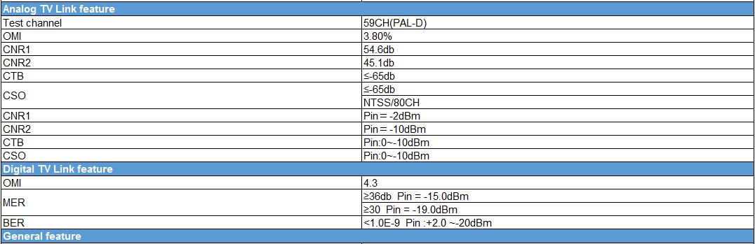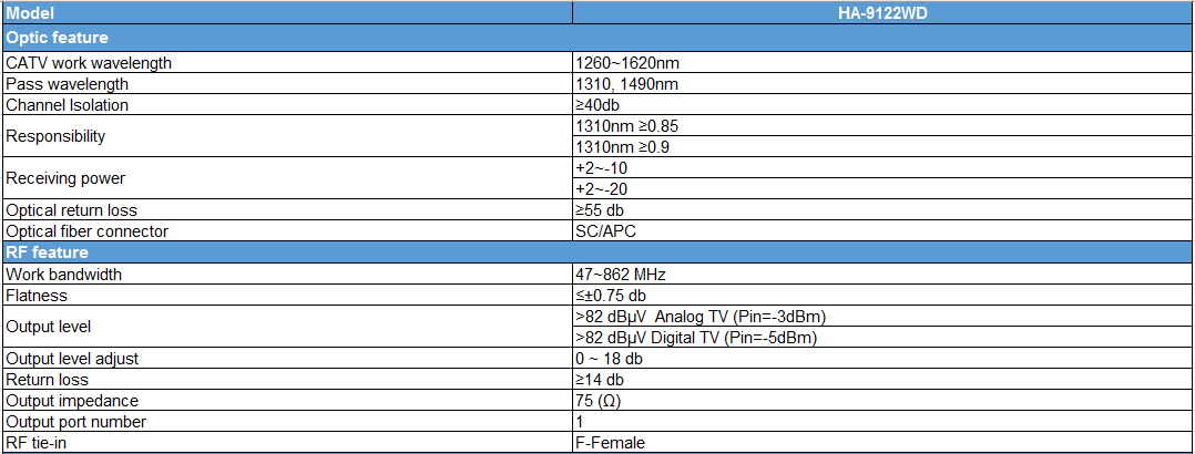 Máy thu quang - Node quang HA-9122WD cho truyền hình Analog, trong Pin =-10dBm khi, Võ ≥ 69dBμV, CNR ≥ 45dB.