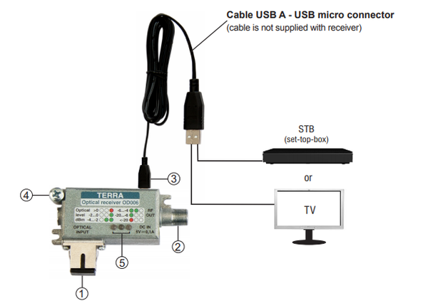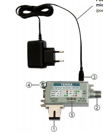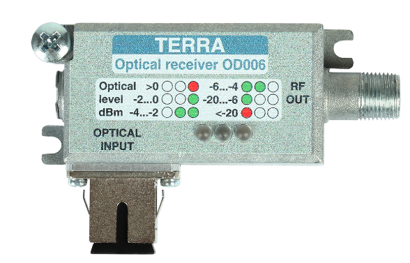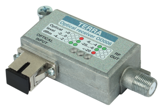Node quang TERRA OD-006 - Máy thu quang FTTH Là một bộ phận của hệ thống truyền hình liên quan đến công nghệ sợi quang. Thiết bị chuyển đổi tín hiệu DVB-T và FM / DAB được cung cấp qua một liên kết quang học thành tín hiệu RF được phân phối cục bộ tới các đầu cuối. Công nghệ quang học được đặc trưng bởi sự suy giảm thấp, nhiễu nhỏ và quan trọng nhất là nó cho phép truyền tín hiệu trên một khoảng cách dài.