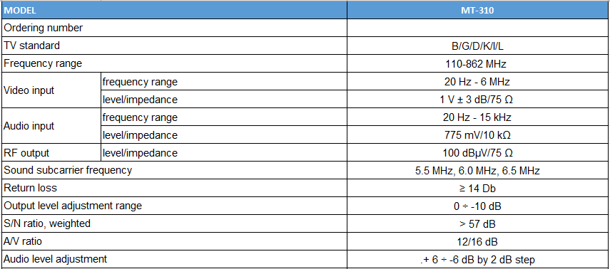 Bộ điều chế TERRA MT-310: có tác dụng chuyển đổi tín hiệu Video/Audio sang tín hiệu RF. Ứng dụng vào việc thiết lập hệ thống truyền hình cáp, trung tâm Headend, mạng truyền hình CATV; chèn tín hiệu các kênh truyền hình vệ tinh, tín hiệu camera , tín hiệu đầu phát DVD… vào hệ thống truyền hình cáp của tòa nhà, khách sạn…..